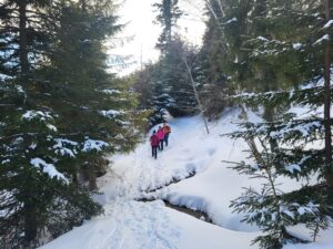 Reggel 6-kor találkozunk Budapesten. Azonnal nekivágunk a Magas-Tátra, közelebbről Matlárháza parkolója felé vezető 4 órás utunknak. 10 óra körül érkezünk, majd felvesszük a magunkkal hozott csúszásgátlónkat és elindulunk a Magas-Tátra legszebb, képeslapra kívánkozó menedékházához vezető úton. A Zöld-tavi menedékház felé a Fehér-víz mentén emelkedünk.